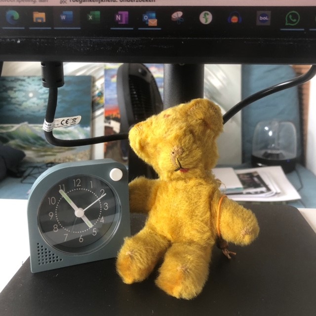 Ik kon het niet laten om mijn teddybeer toch even door de google image zoeker te halen om te zien of de gever toevallig toch een zeldzaam exemplaar aan mij had gegeven. Maar dat bleek niet zo te zijn. Inmiddels meer dan een halve eeuw oud is Ted wel vintage, net als ik. En dus zitten we weer samen. Ik schrijf wat, hij zit leunend tegen mijn computerscherm. Praten doen we niet, dertig jaar eenzame opsluiting in een schoenendoos doet je wel wat natuurlijk. Maar we begrijpen elkaar wel, zoals dat vaak gaat met oude vrienden.